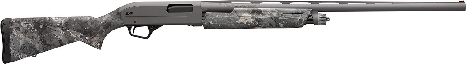 Practice your shooting skills with the Winchester SXP Hybrid Hunter 12 Gauge Pump Shotgun. This weapon features a pump action with a 4+1 firing capacity, as well as a 28-inch barrel length. This shotgun also includes a Truetimber midnight camo stock and a reversible safety button.